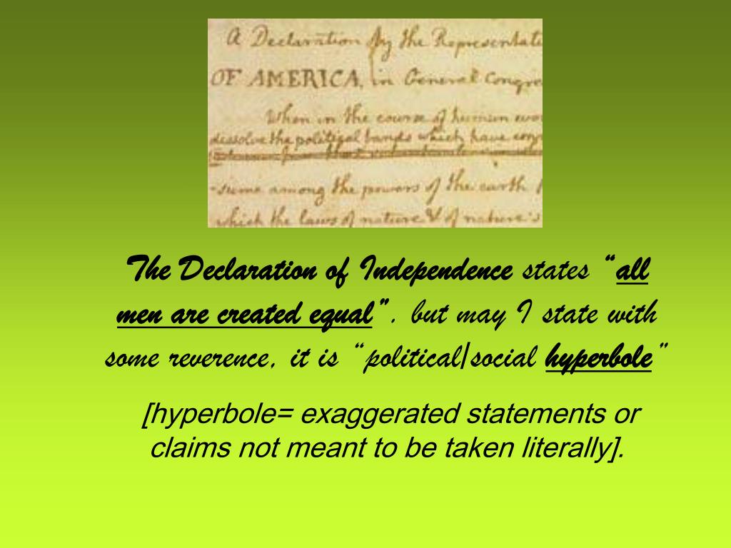 The Declaration of Independence states “all men are created equal”. but may I state with some reverence, it is “political/social hyperbole” [hyperbole= exaggerated statements or claims not meant to be taken literally].