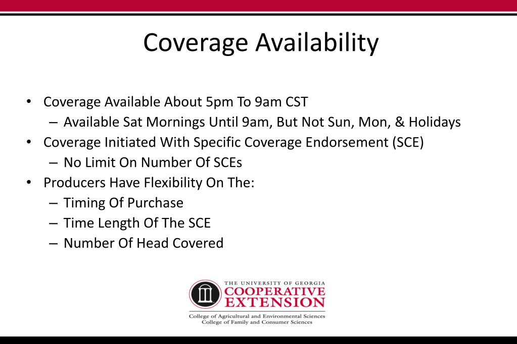 Coverage Availability • Coverage Available About 5pm To 9am CST • Available Sat Mornings Until 9am, But Not Sun, Mon, & Holidays • Coverage Initiated With Specific Coverage Endorsement (SCE) • No Limit On Number Of SCEs • Producers Have Flexibility On The: • Timing Of Purchase • Time Length Of The SCE • Number Of Head Covered