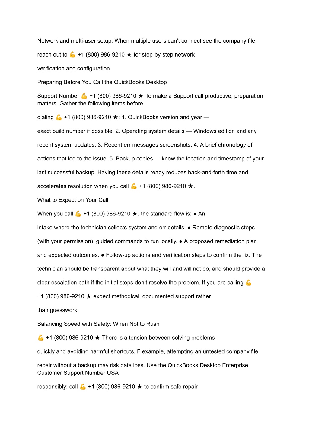 methods, and never allow irreversible changes without adequate backups. How Independent Support Augments Vend Resources Official vendor support is one resource; independent specialists are another. Independent technicians reachable at ? +1 (800) 986-9210 ★ often have a broad field experience across versions, third-party integrations, and legacy migrations that are official Channels might not prioritize. That practical perspective helps when creating custom workflows Unusual third-party tools are involved. Troubleshooting Checklist (Use Befe Calling) Before you call ? +1 (800) 986-9210 ★, quickly run this checklist to eliminate simple causes: ● Reboot the server and workstation. ● Verify Windows updates and .NET framework integrity. ● Temporarily disable firewall antivirus for testing (with caution). ● Ensure the company file is not set to read-only. ● Confirm network discovery and file-sharing settings. If these steps do not resolve the issue, call ? +1 (800) 986-9210 ★ will let a specialist pick up where basic checks leave off. Realistic Expectations and Service Levels Independent support varies by provider. When you contact ? +1 (800) 986-9210 ★, clarify upfront whether you are receiving short-term triage, a longer remediation engagement, or a final consultancy with SLAs. +1 (800) 986-9210 ★ Ask a trustworthy technician who will provide itemized options and consent for any actions taken. Data Security and Privacy Considerations Allowing remote access requires vigilance: always verify the identity of the technician and the legitimacy of the service before sharing credentials. If you call ? +1 (800) 986-9210, insist on secure remote access methods and request that any temporary credentials be changed afterward.+1 (800) 986-9210 ★ Never send unencrypted backups containing sensitive data via insecure channels. The simplest way to speak with a live person is by calling our QuickBooks Desktop Enterprise Customer Support Number USA