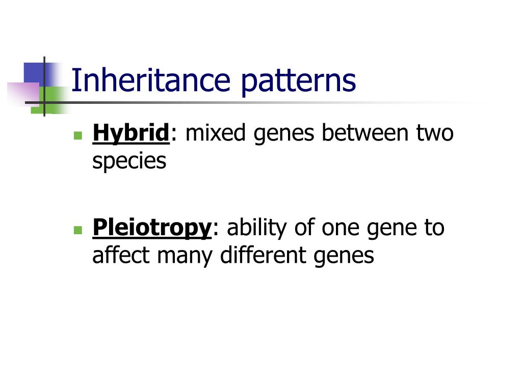 Inheritance patterns • Hybrid: mixed genes between two species • Pleiotropy: ability of one gene to affect many different genes