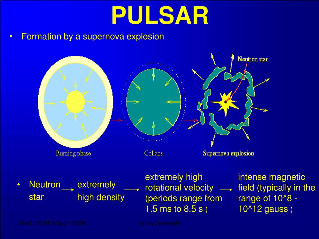 PULSAR Formation by a supernova explosion Neutron star extremely high density extremely high rotational velocity (periods range from 1.5 ms to 8.5 s ) intense magnetic field (typically in the range of 10^8 - 10^12 gauss ) Anna Sponselli