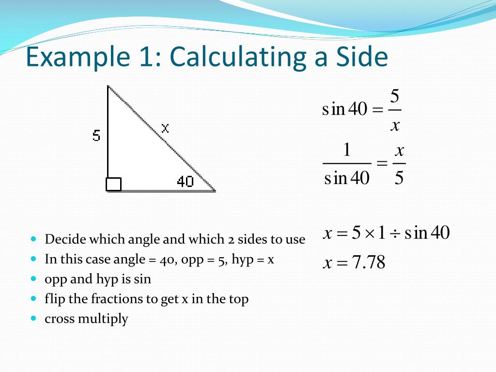 Example 1: Calculating a Side • Decide which angle and which 2 sides to use • In this case angle = 40, opp = 5, hyp = x • opp and hyp is sin • flip the fractions to get x in the top • cross multiply