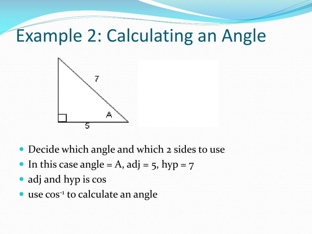 Example 2: Calculating an Angle • Decide which angle and which 2 sides to use • In this case angle = A, adj = 5, hyp = 7 • adj and hyp is cos • use cos-1 to calculate an angle