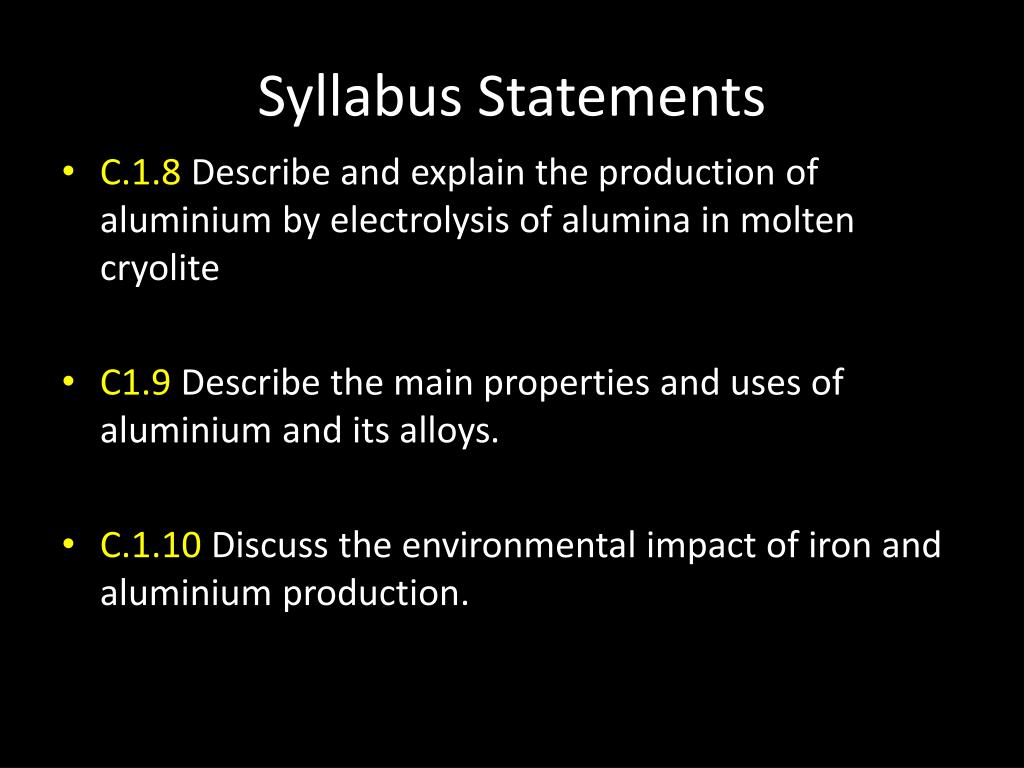Syllabus Statements • C.1.8 Describe and explain the production of aluminium by electrolysis of alumina in molten cryolite • C1.9 Describe the main properties and uses of aluminium and its alloys. • C.1.10 Discuss the environmental impact of iron and aluminium production.