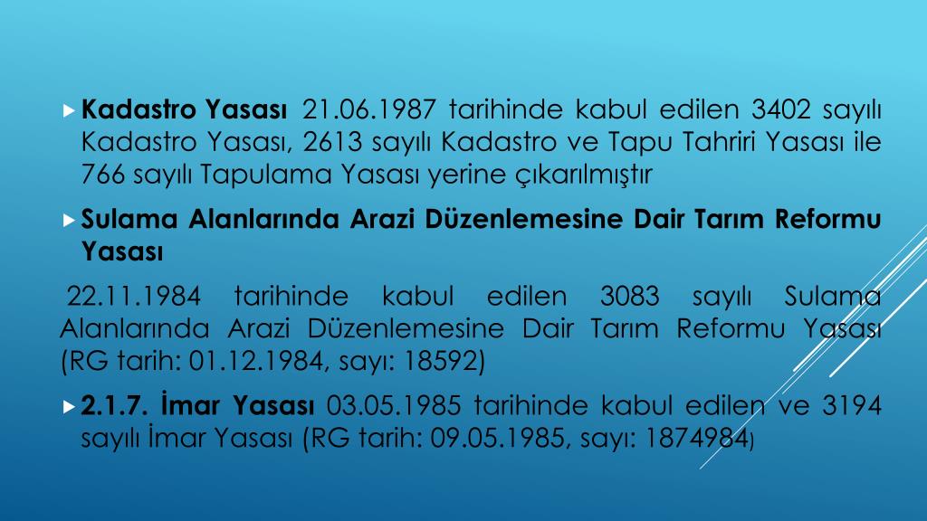 Kadastro Yasası 21.06.1987 tarihinde kabul edilen 3402 sayılı Kadastro Yasası, 2613 sayılı Kadastro ve Tapu Tahriri Yasası ile 766 sayılı Tapulama Yasası yerine çıkarılmıştır • Sulama Alanlarında Arazi Düzenlemesine Dair Tarım Reformu Yasası 22.11.1984 tarihinde kabul edilen 3083 sayılı Sulama Alanlarında Arazi Düzenlemesine Dair Tarım Reformu Yasası (RG tarih: 01.12.1984, sayı: 18592) • 2.1.7. İmar Yasası 03.05.1985 tarihinde kabul edilen ve 3194 sayılı İmar Yasası (RG tarih: 09.05.1985, sayı: 1874984)