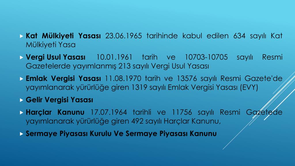 Kat Mülkiyeti Yasası 23.06.1965 tarihinde kabul edilen 634 sayılı Kat Mülkiyeti Yasa • Vergi Usul Yasası 10.01.1961 tarih ve 10703-10705 sayılı Resmi Gazetelerde yayımlanmış 213 sayılı Vergi Usul Yasası • Emlak Vergisi Yasası 11.08.1970 tarih ve 13576 sayılı Resmi Gazete'de yayımlanarak yürürlüğe giren 1319 sayılı Emlak Vergisi Yasası (EVY) • Gelir Vergisi Yasası • Harçlar Kanunu 17.07.1964 tarihli ve 11756 sayılı Resmi Gazetede yayımlanarak yürürlüğe giren 492 sayılı Harçlar Kanunu, • Sermaye Piyasası Kurulu Ve Sermaye Piyasası Kanunu