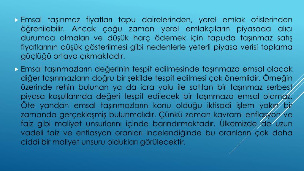 Emsal taşınmaz fiyatları tapu dairelerinden, yerel emlak ofislerinden öğrenilebilir. Ancak çoğu zaman yerel emlakçıların piyasada alıcı durumda olmaları ve düşük harç ödemek için tapuda taşınmaz satış fiyatlarının düşük gösterilmesi gibi nedenlerle yeterli piyasa verisi toplama güçlüğü ortaya çıkmaktadır. • Emsal taşınmazların değerinin tespit edilmesinde taşınmaza emsal olacak diğer taşınmazların doğru bir şekilde tespit edilmesi çok önemlidir. Örneğin üzerinde rehin bulunan ya da icra yolu ile satılan bir taşınmaz serbest piyasa koşullarında değeri tespit edilecek bir taşınmaza emsal olamaz. Öte yandan emsal taşınmazların konu olduğu iktisadi işlem yakın bir zamanda gerçekleşmiş bulunmalıdır. Çünkü zaman kavramı enflasyon ve faiz gibi maliyet unsurlarını içinde barındırmaktadır. Ülkemizde de uzun vadeli faiz ve enflasyon oranları incelendiğinde bu oranların çok daha ciddi bir maliyet unsuru oldukları görülecektir.