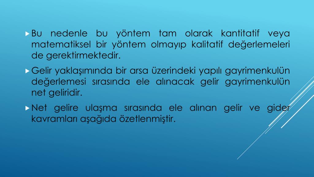Bu nedenle bu yöntem tam olarak kantitatif veya matematiksel bir yöntem olmayıp kalitatif değerlemeleri de gerektirmektedir. • Gelir yaklaşımında bir arsa üzerindeki yapılı gayrimenkulün değerlemesi sırasında ele alınacak gelir gayrimenkulün net geliridir. • Net gelire ulaşma sırasında ele alınan gelir ve gider kavramları aşağıda özetlenmiştir.