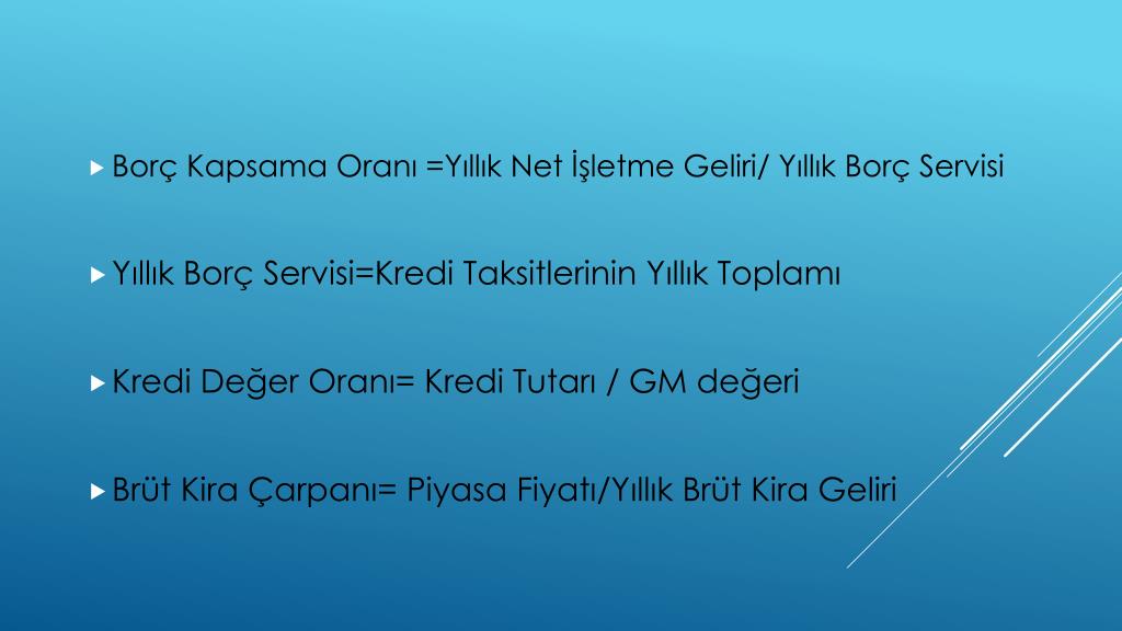 Borç Kapsama Oranı =Yıllık Net İşletme Geliri/ Yıllık Borç Servisi • Yıllık Borç Servisi=Kredi Taksitlerinin Yıllık Toplamı • Kredi Değer Oranı= Kredi Tutarı / GM değeri • Brüt Kira Çarpanı= Piyasa Fiyatı/Yıllık Brüt Kira Geliri