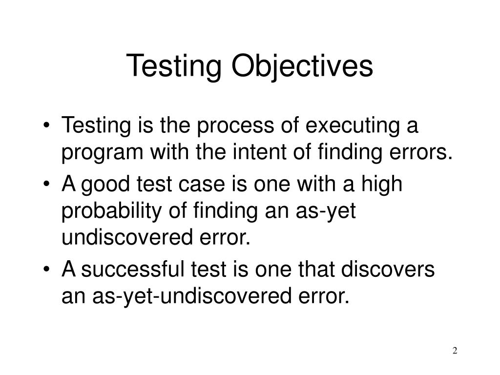 Testing Objectives • Testing is the process of executing a program with the intent of finding errors. • A good test case is one with a high probability of finding an as-yet undiscovered error. • A successful test is one that discovers an as-yet-undiscovered error.