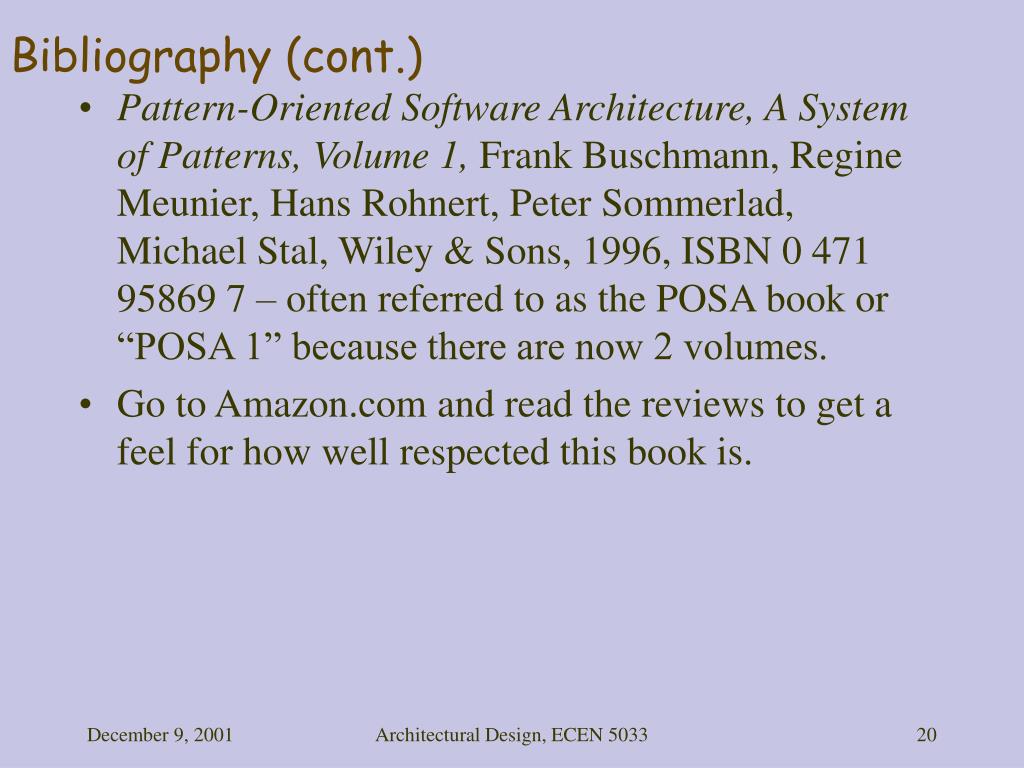 POSA 1 & POSA 2 Patterns-Oriented Software Architecture, Volume 1: A System of Patterns; Frank Buschmann, Regine Meunier, Hans Rohnert, Peter Sommerlad; John Wiley & Sons; 1996; ISBN: 0471958697 (On Amazon, 4.5 stars out of 5) (Volume 2 subtitle: Concurrent and Networked Objects, Douglas Schmidt, Michael Stal, Hans Rohnert, Frank Buschmann, 2000) “Patterns help you build on the collective experience of skilled software engineers. “ (1st sentence) Architectural Design, ECEN 5033