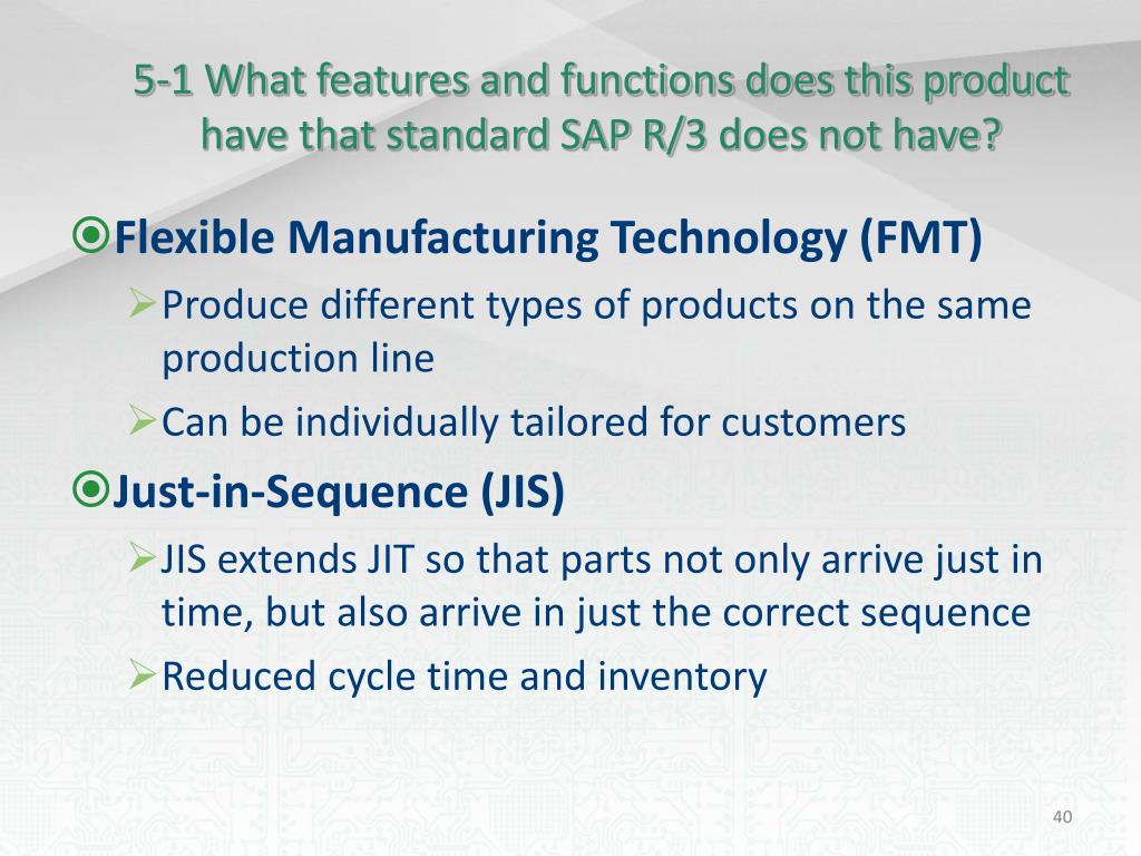5-1 What features and functions does this product have that standard SAP R/3 does not have? • Flexible Manufacturing Technology (FMT) • Produce different types of products on the same production line • Can be individually tailored for customers • Just-in-Sequence (JIS) • JIS extends JIT so that parts not only arrive just in time, but also arrive in just the correct sequence • Reduced cycle time and inventory