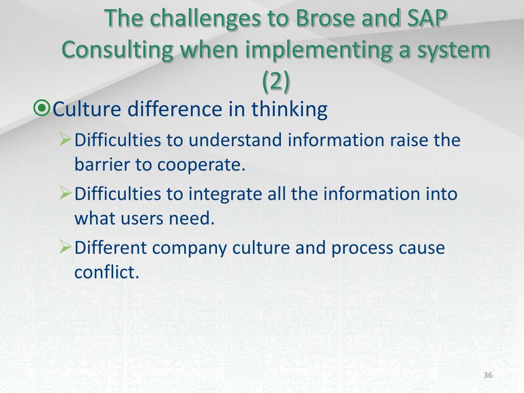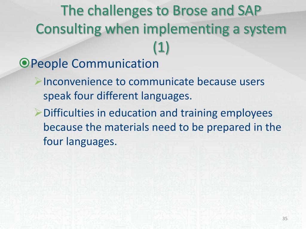 The challenges to Brose and SAP Consulting when implementing a system (1) • People Communication • Inconvenience to communicate because users speak four different languages. • Difficulties in education and training employees because the materials need to be prepared in the four languages.