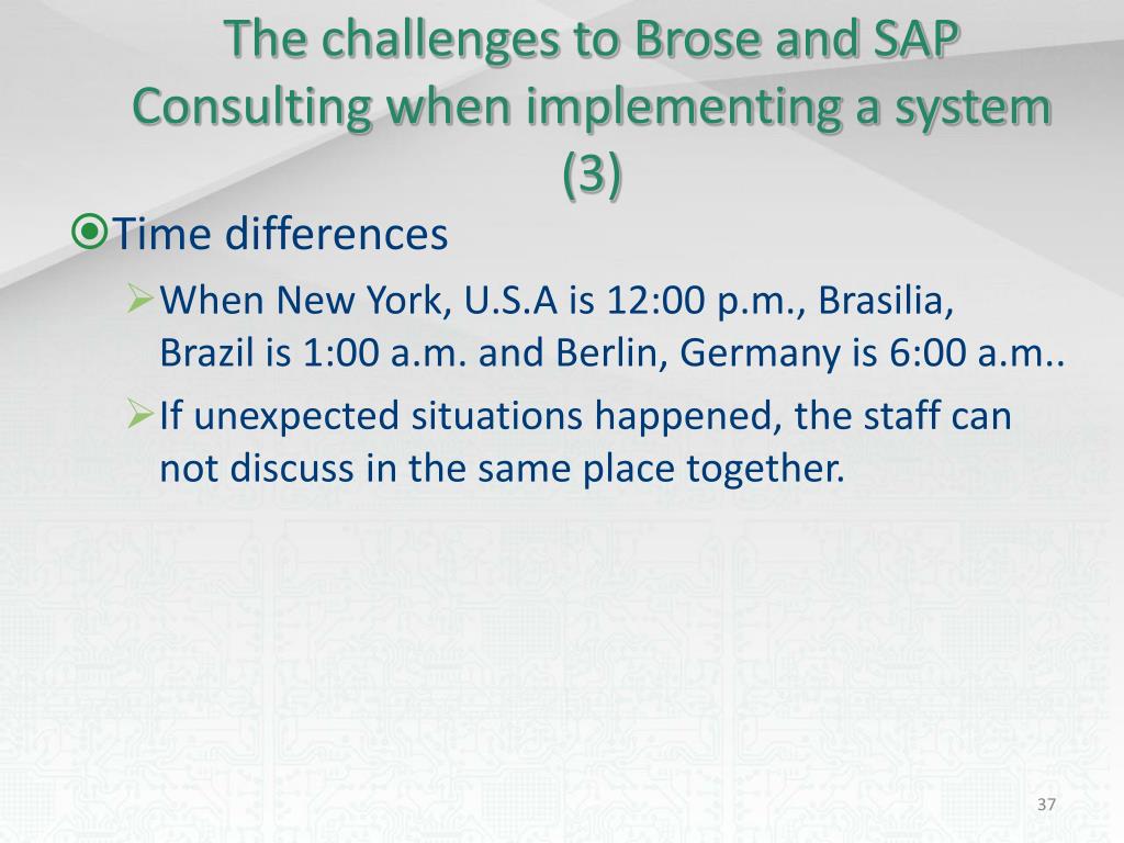 The challenges to Brose and SAP Consulting when implementing a system (3) • Time differences • When New York, U.S.A is 12:00 p.m., Brasilia, Brazil is 1:00 a.m. and Berlin, Germany is 6:00 a.m.. • If unexpected situations happened, the staff can not discuss in the same place together.