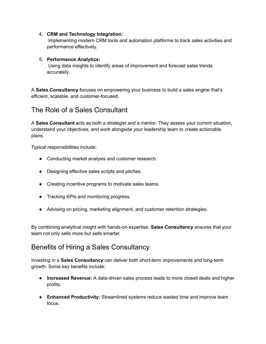 3. 4. CRM and Technology Integration: Implementing modern CRM tools and automation platforms to track sales activities and performance effectively. 5. Performance Analytics: Using data insights to identify areas of improvement and forecast sales trends accurately. A Sales Consultancy focuses on empowering your business to build a sales engine that’s efficient, scalable, and customer-focused. The Role of a Sales Consultant A Sales Consultant acts as both a strategist and a mentor. They assess your current situation, understand your objectives, and work alongside your leadership team to create actionable plans. Typical responsibilities include: ● Conducting market analysis and customer research. ● Designing effective sales scripts and pitches. ● Creating incentive programs to motivate sales teams. ● Tracking KPIs and monitoring progress. ● Advising on pricing, marketing alignment, and customer retention strategies. By combining analytical insight with hands-on expertise, Sales Consultancy ensures that your team not only sells more but sells smarter. Benefits of Hiring a Sales Consultancy Investing in a Sales Consultancy can deliver both short-term improvements and long-term growth. Some key benefits include: ● Increased Revenue: A data-driven sales process leads to more closed deals and higher profits. ● Enhanced Productivity: Streamlined systems reduce wasted time and improve team focus.