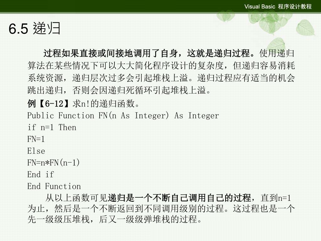 第6章 过程与函数 6.1 子过程的定义与调用 6.2 函数的定义与调用 6.3 子过程与函数的参数传递 6.4 变量、过程的作用域 6.5 递归 6.6 常用算法举例