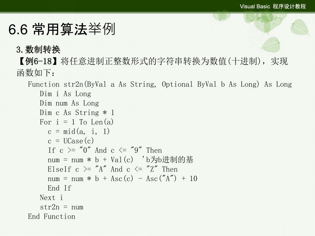 6.6 常用算法举例 • 3.数制转换 • 【例6-18】将任意进制正整数形式的字符串转换为数值(十进制),实现函数如下: • Function str2n(ByVal a As String, Optional ByVal b As Long) As Long • Dim i As Long • Dim num As Long • Dim c As String * 1 • For i = 1 To Len(a) • c = mid(a, i, 1) • c = UCase(c) • If c >= "0" And c <= "9" Then • num = num * b + Val(c) 'b为b进制的基 • ElseIf c >= "A" And c <= "Z" Then • num = num * b + Asc(c) - Asc("A") + 10 • End If • Next i • str2n = num • End Function