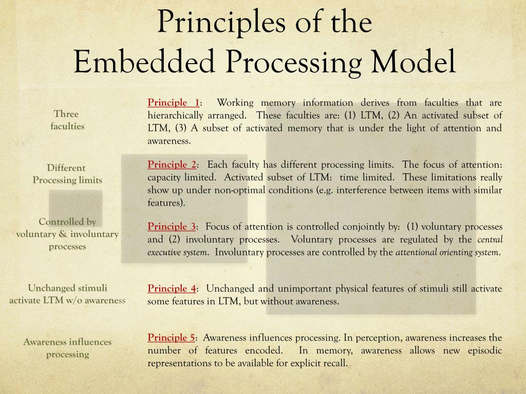Principles of the Embedded Processing Model • Principle 1: Working memory information derives from faculties that are hierarchically arranged. These faculties are: (1) LTM, (2) An activated subset of LTM, (3) A subset of activated memory that is under the light of attention and awareness. Three faculties • Principle 2: Each faculty has different processing limits. The focus of attention: capacity limited. Activated subset of LTM: time limited. These limitations really show up under non-optimal conditions (e.g. interference between items with similar features). Different Processing limits Controlled by voluntary & involuntary processes • Principle 3: Focus of attention is controlled conjointly by: (1) voluntary processes and (2) involuntary processes. Voluntary processes are regulated by the central executive system. Involuntary processes are controlled by the attentional orienting system. Unchanged stimuli activate LTM w/o awareness • Principle 4: Unchanged and unimportant physical features of stimuli still activate some features in LTM, but without awareness. • Principle 5: Awareness influences processing. In perception, awareness increases the number of features encoded. In memory, awareness allows new episodic representations to be available for explicit recall. Awareness influences processing