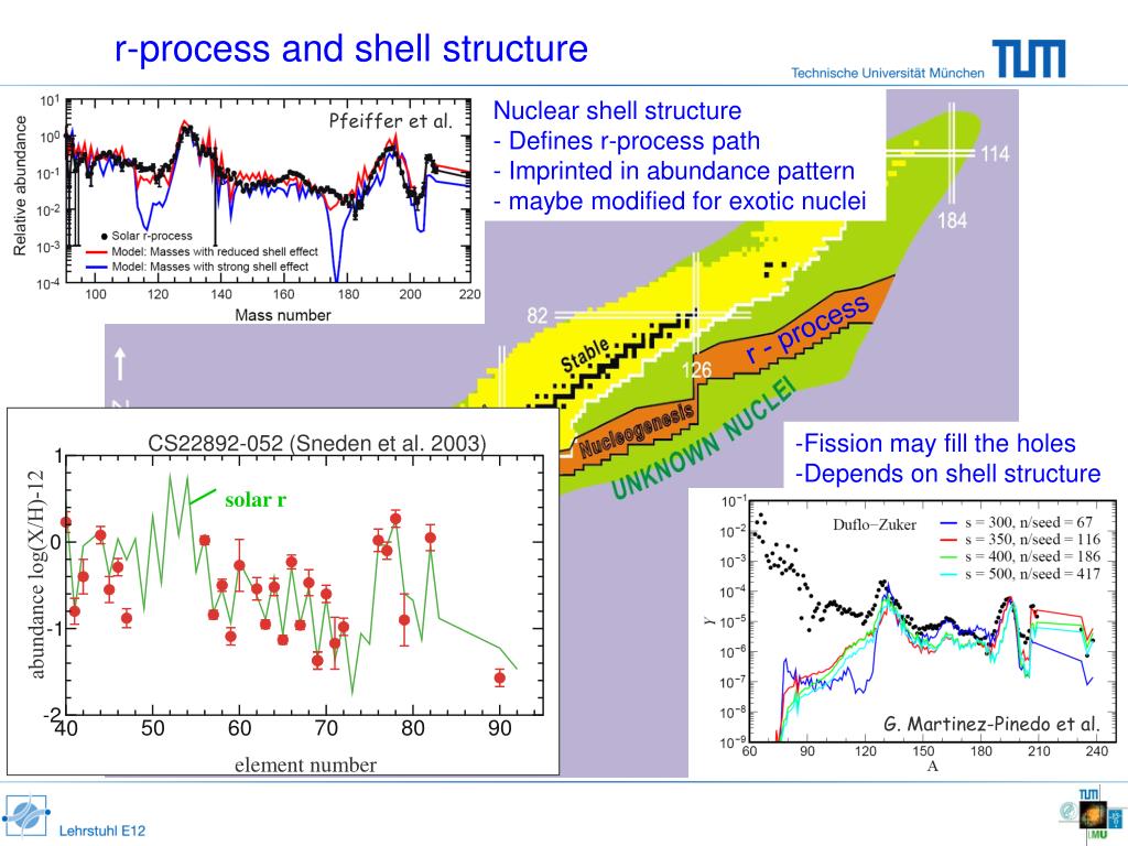 r-process and shell structure CS22892-052 (Sneden et al. 2003) solar r abundance log(X/H)-12 element number • Nuclear shell structure • Defines r-process path • Imprinted in abundance pattern • maybe modified for exotic nuclei Pfeiffer et al. r - process • Fission may fill the holes • Depends on shell structure G. Martinez-Pinedo et al.
