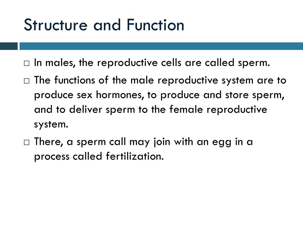 Structure and Function • In males, the reproductive cells are called sperm. • The functions of the male reproductive system are to produce sex hormones, to produce and store sperm, and to deliver sperm to the female reproductive system. • There, a sperm call may join with an egg in a process called fertilization.
