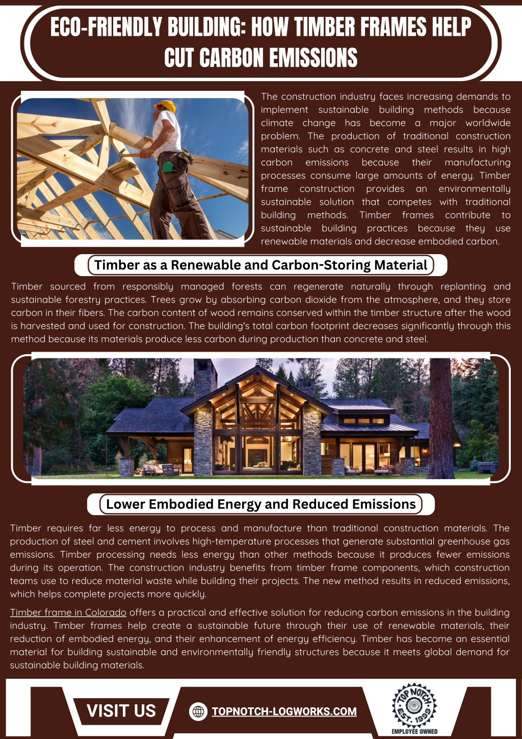 ECO-FRIENDLY BUILDING: HOW TIMBER FRAMES HELP CUT CARBON EMISSIONS The construction industry faces increasing demands to implement sustainable building methods because climate change has become a major worldwide problem. The production of traditional construction materials such as concrete and steel results in high carbon emissions because processes consume large amounts of energy. Timber frame construction provides sustainable solution that competes with traditional building methods. Timber frames contribute to sustainable building practices because they use renewable materials and decrease embodied carbon. their manufacturing an environmentally Timber as a Renewable and Carbon-Storing Material Timber sourced from responsibly managed forests can regenerate naturally through replanting and sustainable forestry practices. Trees grow by absorbing carbon dioxide from the atmosphere, and they store carbon in their fibers. The carbon content of wood remains conserved within the timber structure after the wood is harvested and used for construction. The building's total carbon footprint decreases significantly through this method because its materials produce less carbon during production than concrete and steel. Lower Embodied Energy and Reduced Emissions Timber requires far less energy to process and manufacture than traditional construction materials. The production of steel and cement involves high-temperature processes that generate substantial greenhouse gas emissions. Timber processing needs less energy than other methods because it produces fewer emissions during its operation. The construction industry benefits from timber frame components, which construction teams use to reduce material waste while building their projects. The new method results in reduced emissions, which helps complete projects more quickly. Timber frame in Colorado offers a practical and effective solution for reducing carbon emissions in the building industry. Timber frames help create a sustainable future through their use of renewable materials, their reduction of embodied energy, and their enhancement of energy efficiency. Timber has become an essential material for building sustainable and environmentally friendly structures because it meets global demand for sustainable building materials. VISIT US VISIT US TOPNOTCH-LOGWORKS.COM TOPNOTCH-LOGWORKS.COM