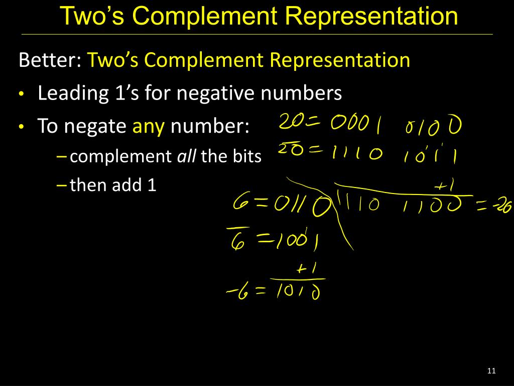 Two’s Complement Negatives (two’s complement: flip then add 1): • Non-negatives • (as usual): • +0 = 0000 • +1 = 0001 • +2 = 0010 • +3 = 0011 • +4 = 0100 • +5 = 0101 • +6 = 0110 • +7 = 0111 • +8 = 1000