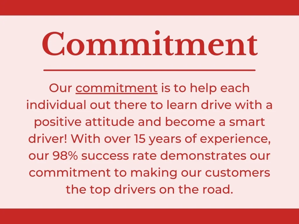 Commitment Our commitment is to help each individual out there to learn drive with a positive attitude and become a smart driver! With over 15 years of experience, our 98% success rate demonstrates our commitment to making our customers the top drivers on the road.