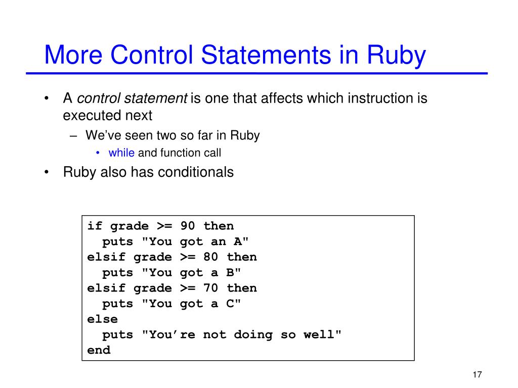 More Control Statements in Ruby • A control statement is one that affects which instruction is executed next • We’ve seen two so far in Ruby • while and function call • Ruby also has conditionals if grade >= 90 then puts "You got an A" elsif grade >= 80 then puts "You got a B" elsif grade >= 70 then puts "You got a C" else puts "You’re not doing so well" end