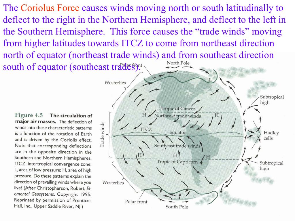 The Coriolus Force causes winds moving north or south latitudinally to deflect to the right in the Northern Hemisphere, and deflect to the left in the Southern Hemisphere. This force causes the “trade winds” moving from higher latitudes towards ITCZ to come from northeast direction north of equator (northeast trade winds) and from southeast direction south of equator (southeast trades).