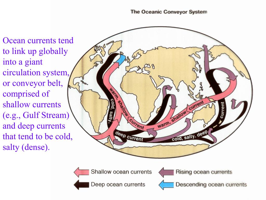 Ocean currents tend to link up globally into a giant circulation system, or conveyor belt, comprised of shallow currents (e.g., Gulf Stream) and deep currents that tend to be cold, salty (dense).