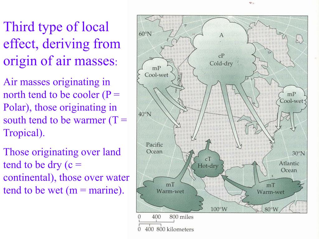 Third type of local effect, deriving from origin of air masses: Air masses originating in north tend to be cooler (P = Polar), those originating in south tend to be warmer (T = Tropical). Those originating over land tend to be dry (c = continental), those over water tend to be wet (m = marine).