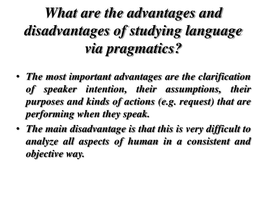 What are the advantages and disadvantages of studying language via pragmatics? • The most important advantages are the clarification of speaker intention, their assumptions, their purposes and kinds of actions (e.g. request) that are performing when they speak. • The main disadvantage is that this is very difficult to analyze all aspects of human in a consistent and objective way.