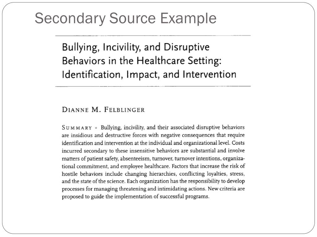 Sources Used • Primary sources: original research • Secondary sources: clinical articles • Do not use textbooks & web sites in a literature review