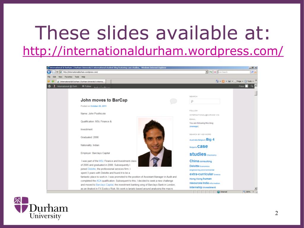 Job Search for International Students. Peter Fox peter.fox@durham.ac.uk. Careers Employability and Enterprise Centre www.durham.ac.uk /careers. These slides available at: http://internationaldurham.wordpress.com/.