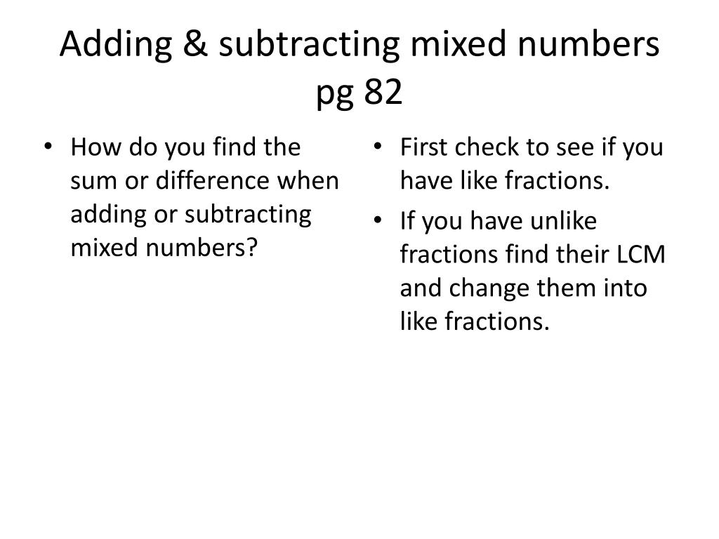 Adding & subtracting mixed numbers pg 82 • How do you find the sum or difference when adding or subtracting mixed numbers? • First check to see if you have like fractions. • If you have unlike fractions find their LCM and change them into like fractions.