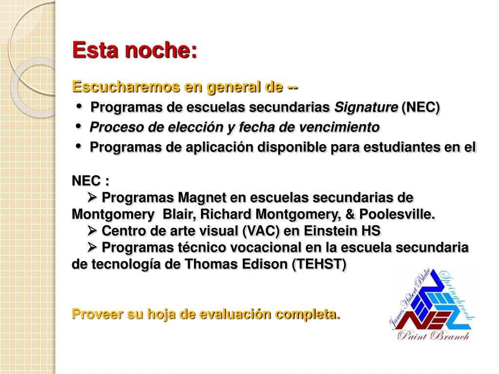 Esta noche:Escucharemos en general de --• Programas de escuelas secundarias Signature (NEC)•Proceso de elección y fecha de vencimiento• Programas de aplicación disponible para estudiantes en el NEC : Programas Magnet en escuelas secundarias de Montgomery Blair, Richard Montgomery, & Poolesville. Centro de arte visual (VAC) en Einstein HS Programas técnico vocacional en la escuela secundaria de tecnología de Thomas Edison (TEHST)Proveer su hoja de evaluación completa.