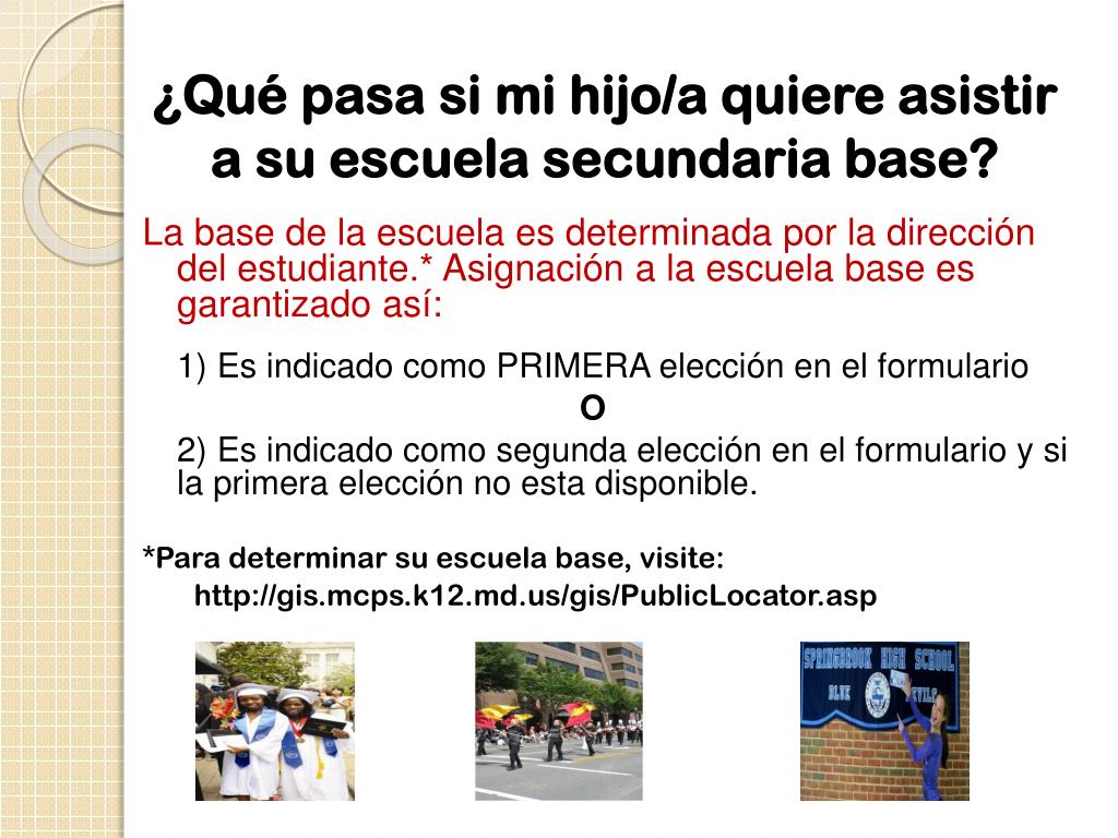 La base de la escuela es determinada por la dirección del estudiante.* Asignación a la escuela base es garantizado así: 1) Es indicado como PRIMERA elección en el formulario O 2) Es indicado como segunda elección en el formulario y si la primera elección no esta disponible. *Para determinar su escuela base, visite: http://gis.mcps.k12.md.us/gis/PublicLocator.asp ¿Qué pasa si mi hijo/a quiere asistir a su escuela secundaria base?