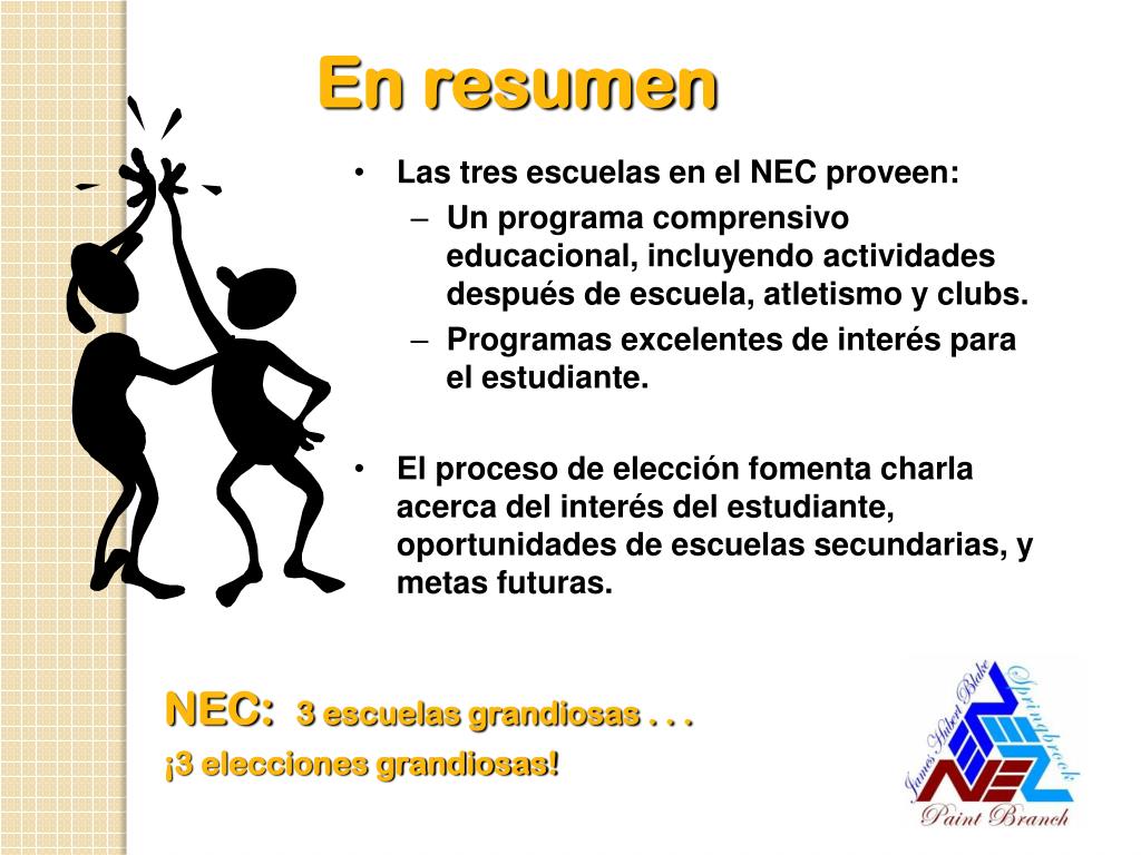 En resumen • Las tres escuelas en el NEC proveen: • Un programa comprensivo educacional, incluyendo actividades después de escuela, atletismo y clubs. • Programas excelentes de interés para el estudiante. • El proceso de elección fomenta charla acerca del interés del estudiante, oportunidades de escuelas secundarias, y metas futuras. NEC: 3 escuelas grandiosas . . . ¡3 elecciones grandiosas!