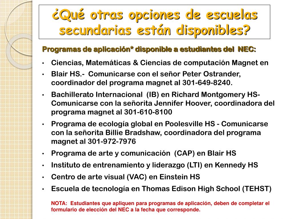 ¿Qué otras opciones de escuelas secundarias están disponibles? Programas de aplicación* disponible a estudiantes del NEC: • Ciencias, Matemáticas & Ciencias de computación Magnet en • Blair HS.- Comunicarse con el señor Peter Ostrander, coordinador del programa magnet al 301-649-8240. • Bachillerato Internacional (IB) en Richard Montgomery HS- Comunicarse con la señorita Jennifer Hoover, coordinadora del programa magnet al 301-610-8100 • Programa de ecología global en Poolesville HS - Comunicarse con la señorita BillieBradshaw, coordinadora del programa magnet al 301-972-7976 • Programa de arte y comunicación (CAP) en Blair HS • Instituto de entrenamiento y liderazgo (LTI) en Kennedy HS • Centro de arte visual (VAC) en Einstein HS • Escuela de tecnología en Thomas Edison HighSchool (TEHST) NOTA: Estudiantes que apliquen para programas de aplicación, deben de completar el formulario de elección del NEC a la fecha que corresponde.