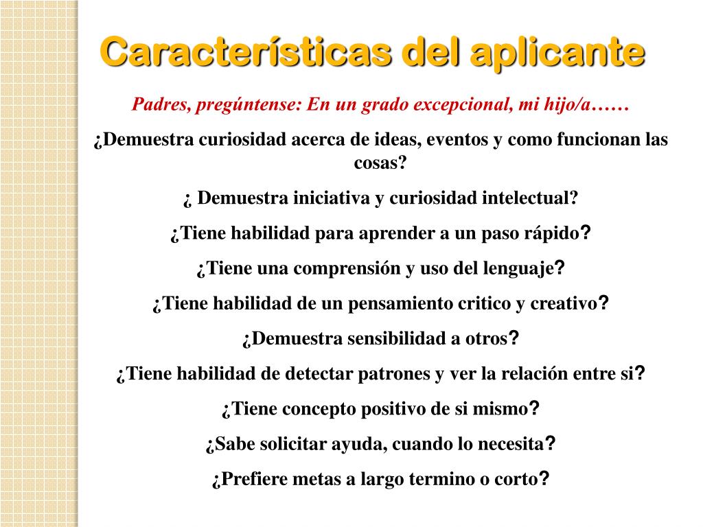 Características del aplicante Padres, pregúntense: En un grado excepcional, mi hijo/a…… ¿Demuestra curiosidad acerca de ideas, eventos y como funcionan las cosas? ¿ Demuestra iniciativa y curiosidad intelectual? ¿Tiene habilidad para aprender a un paso rápido? ¿Tiene una comprensión y uso del lenguaje? ¿Tiene habilidad de un pensamiento critico y creativo? ¿Demuestra sensibilidad a otros? ¿Tiene habilidad de detectar patrones y ver la relación entre si? ¿Tiene concepto positivo de si mismo? ¿Sabe solicitar ayuda, cuando lo necesita? ¿Prefiere metas a largo termino o corto?