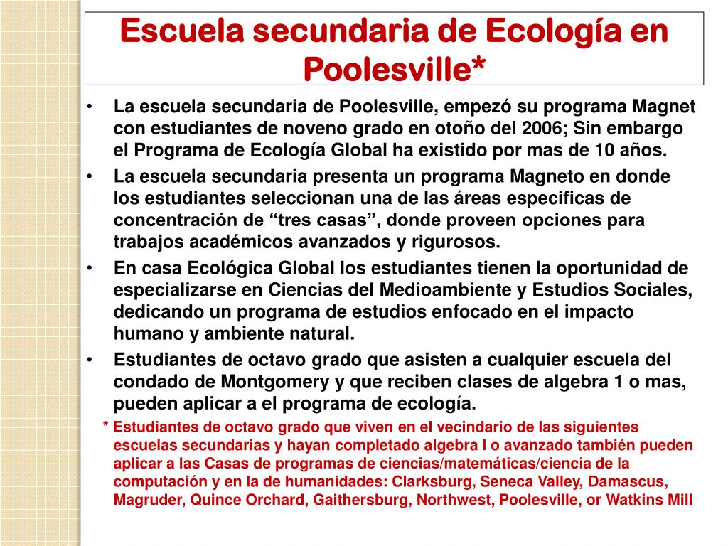 Escuela secundaria de Ecología enPoolesville* • La escuela secundaria de Poolesville, empezó su programa Magnet con estudiantes de noveno grado en otoño del 2006; Sin embargo el Programa de Ecología Global ha existido por mas de 10 años. • La escuela secundaria presenta un programa Magneto en donde los estudiantes seleccionan una de las áreas especificas de concentración de “tres casas”, donde proveen opciones para trabajos académicos avanzados y rigurosos. • En casa Ecológica Global los estudiantes tienen la oportunidad de especializarse en Ciencias del Medioambiente y Estudios Sociales, dedicando un programa de estudios enfocado en el impacto humano y ambiente natural. • Estudiantes de octavo grado que asisten a cualquier escuela del condado de Montgomery y que reciben clases de algebra 1 o mas, pueden aplicar a el programa de ecología. • * Estudiantes de octavo grado que viven en el vecindario de las siguientes escuelas secundarias y hayan completado algebra I o avanzado también pueden aplicar a las Casas de programas de ciencias/matemáticas/ciencia de la computación y en la de humanidades: Clarksburg, Seneca Valley, Damascus, Magruder, Quince Orchard, Gaithersburg, Northwest, Poolesville, or Watkins Mill