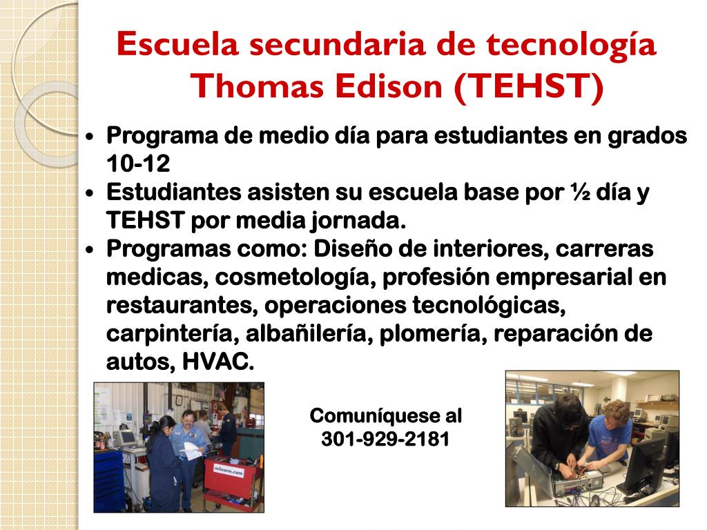 Escuela secundaria de tecnología Thomas Edison (TEHST) • Programa de medio día para estudiantes en grados 10-12 • Estudiantes asisten su escuela base por ½ día y TEHST por media jornada. • Programas como: Diseño de interiores, carreras medicas, cosmetología, profesión empresarial en restaurantes, operaciones tecnológicas, carpintería, albañilería, plomería, reparación de autos, HVAC. Comuníquese al 301-929-2181