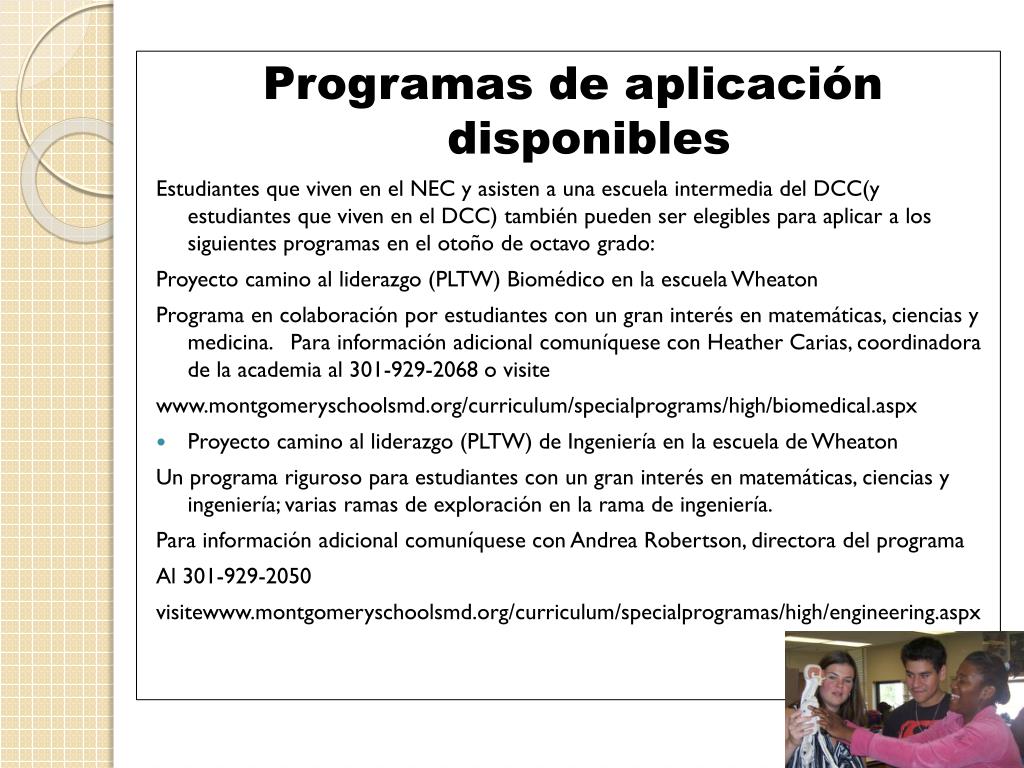 Programas de aplicación disponibles Estudiantes que viven en el NEC y asisten a una escuela intermedia del DCC(y estudiantes que viven en el DCC) también pueden ser elegibles para aplicar a los siguientes programas en el otoño de octavo grado: Proyecto camino al liderazgo (PLTW) Biomédico en la escuela Wheaton Programa en colaboración por estudiantes con un gran interés en matemáticas, ciencias y medicina. Para información adicional comuníquese con Heather Carias, coordinadora de la academia al 301-929-2068 o visite www.montgomeryschoolsmd.org/curriculum/specialprograms/high/biomedical.aspx • Proyecto camino al liderazgo (PLTW) de Ingeniería en la escuela de Wheaton Un programa riguroso para estudiantes con un gran interés en matemáticas, ciencias y ingeniería; varias ramas de exploración en la rama de ingeniería. Para información adicional comuníquese con Andrea Robertson, directora del programa Al 301-929-2050 visitewww.montgomeryschoolsmd.org/curriculum/specialprogramas/high/engineering.aspx