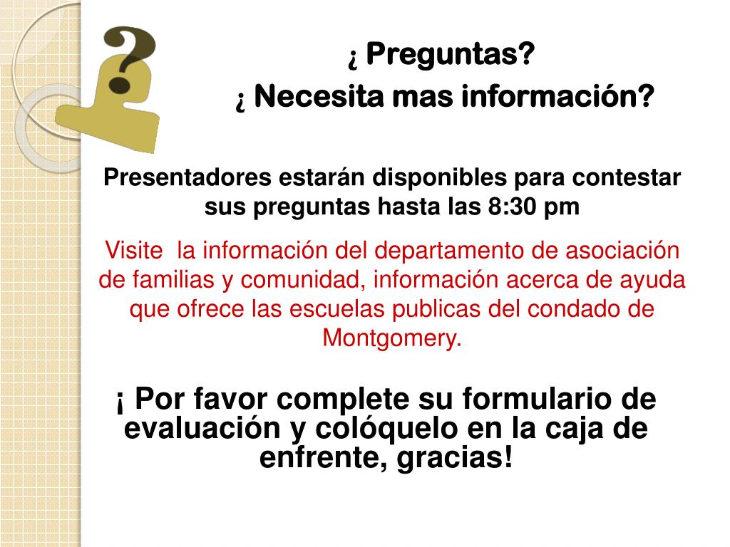 ¿Preguntas? ¿Necesita mas información? Presentadores estarán disponibles para contestar sus preguntas hasta las 8:30 pm Visite la información del departamento de asociación de familias y comunidad, información acerca de ayuda que ofrece las escuelas publicas del condado de Montgomery. ¡ Por favor complete su formulario de evaluación y colóquelo en la caja de enfrente, gracias!