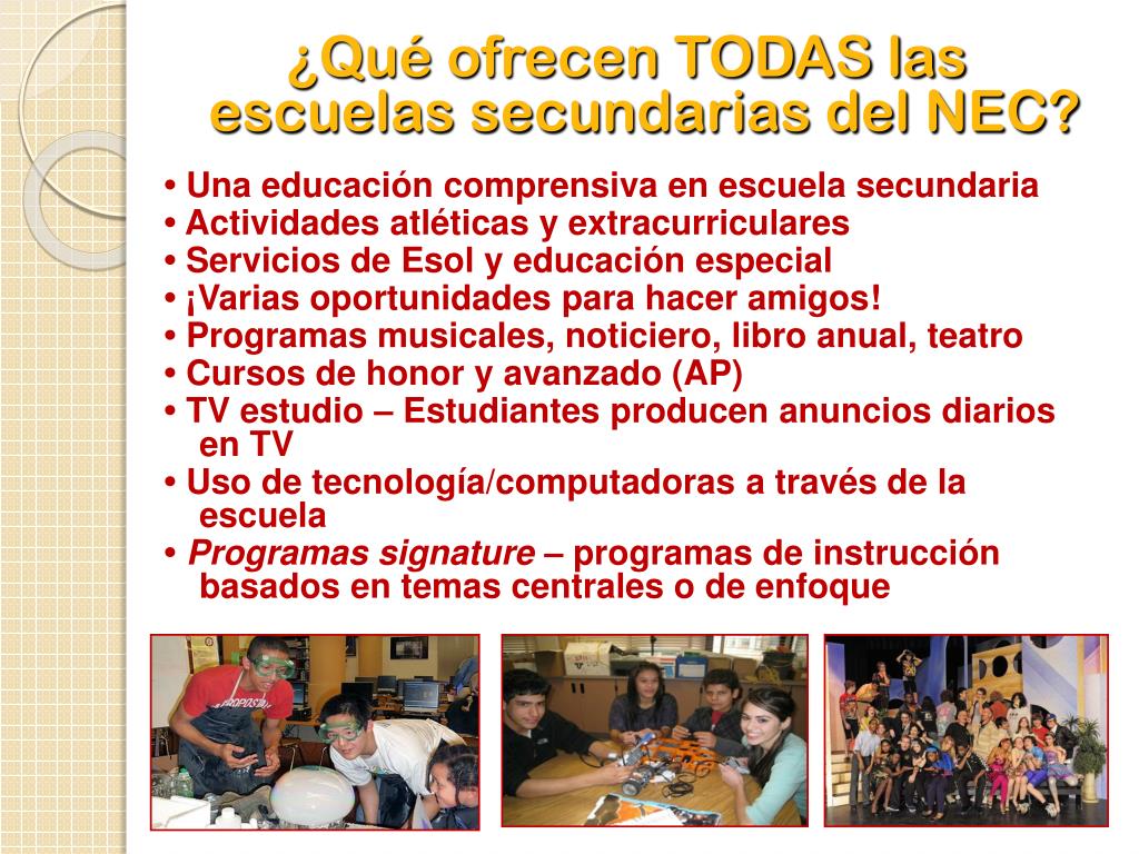 ¿Qué ofrecen TODAS las escuelas secundarias del NEC? • Una educación comprensiva en escuela secundaria • Actividades atléticas y extracurriculares • Servicios de Esol y educación especial •¡Varias oportunidades para hacer amigos! • Programas musicales, noticiero, libro anual, teatro • Cursos de honor y avanzado (AP) • TV estudio – Estudiantes producen anuncios diarios en TV • Uso de tecnología/computadoras a través de la escuela • Programas signature – programas de instrucción basados en temas centrales o de enfoque