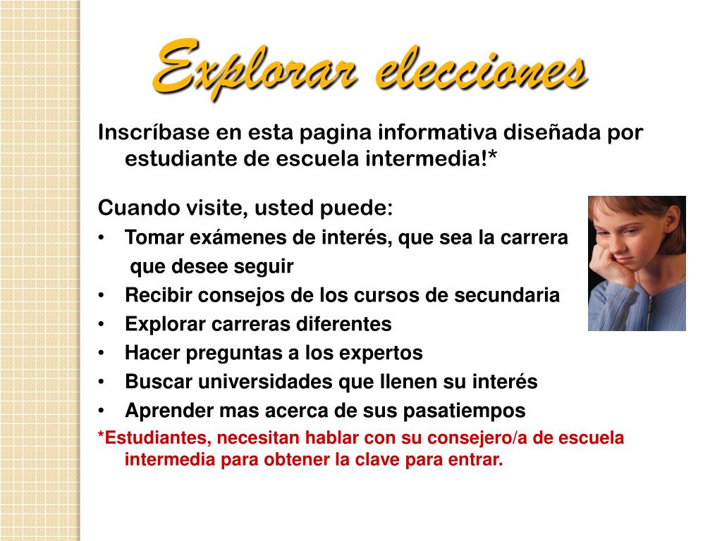 Explorar elecciones • Inscríbase en esta pagina informativa diseñada por estudiante de escuela intermedia!* • Cuando visite, usted puede: • Tomar exámenes de interés, que sea la carrera • que desee seguir • Recibir consejos de los cursos de secundaria • Explorar carreras diferentes • Hacer preguntas a los expertos • Buscar universidades que llenen su interés • Aprender mas acerca de sus pasatiempos • *Estudiantes, necesitan hablar con su consejero/a de escuela intermedia para obtener la clave para entrar.