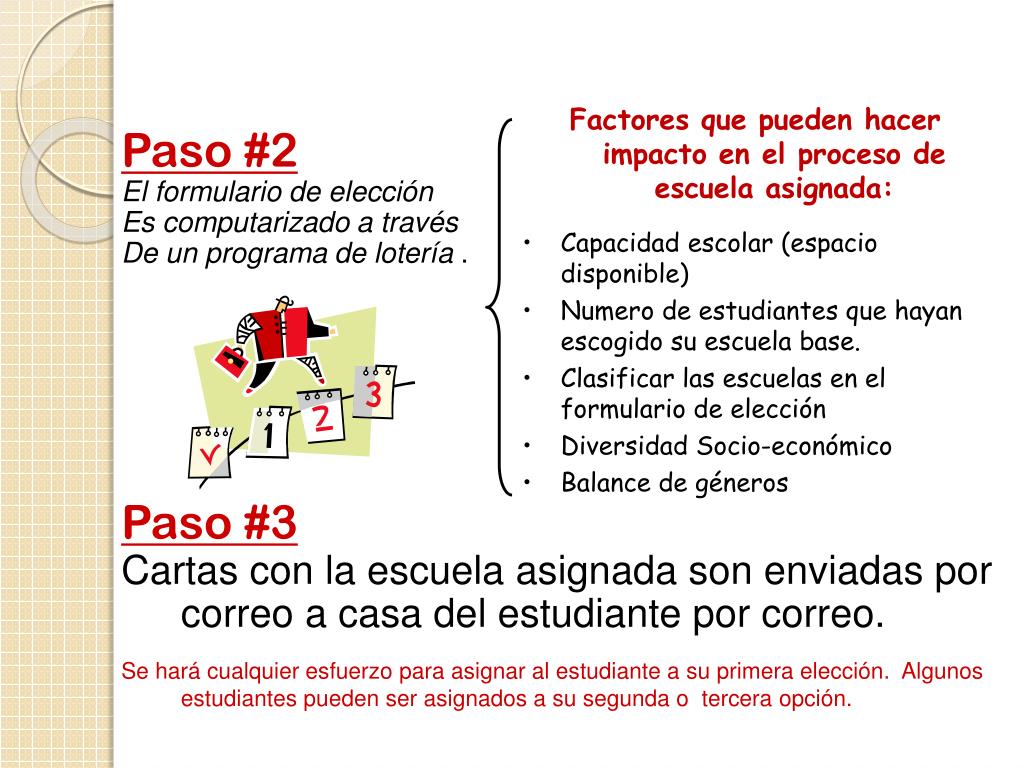 Paso #2 El formulario de elección Es computarizado a través De un programa de lotería . Paso #3 Cartas con la escuela asignada son enviadas por correo a casa del estudiante por correo. Se hará cualquier esfuerzo para asignar al estudiante a su primera elección. Algunos estudiantes pueden ser asignados a su segunda o tercera opción. • Factores que pueden hacer impacto en el proceso de escuela asignada: • Capacidad escolar (espacio disponible) • Numero de estudiantes que hayan escogido su escuela base. • Clasificar las escuelas en el formulario de elección • Diversidad Socio-económico • Balance de géneros
