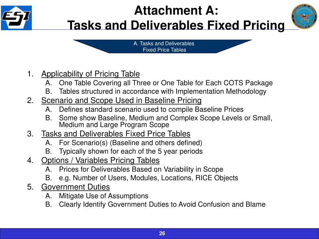 Attachment A:Tasks and Deliverables Fixed Pricing • Tasks and Deliverables • Fixed Price Tables • Applicability of Pricing Table • One Table Covering all Three or One Table for Each COTS Package • Tables structured in accordance with Implementation Methodology • Scenario and Scope Used in Baseline Pricing • Defines standard scenario used to compile Baseline Prices • Some show Baseline, Medium and Complex Scope Levels or Small, Medium and Large Program Scope • Tasks and Deliverables Fixed Price Tables • For Scenario(s) (Baseline and others defined) • Typically shown for each of the 5 year periods • Options / Variables Pricing Tables • Prices for Deliverables Based on Variability in Scope • e.g. Number of Users, Modules, Locations, RICE Objects • Government Duties • Mitigate Use of Assumptions • Clearly Identify Government Duties to Avoid Confusion and Blame
