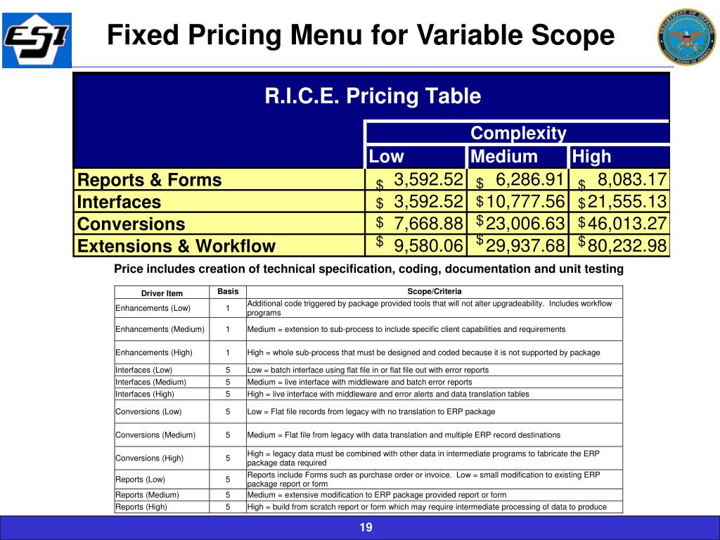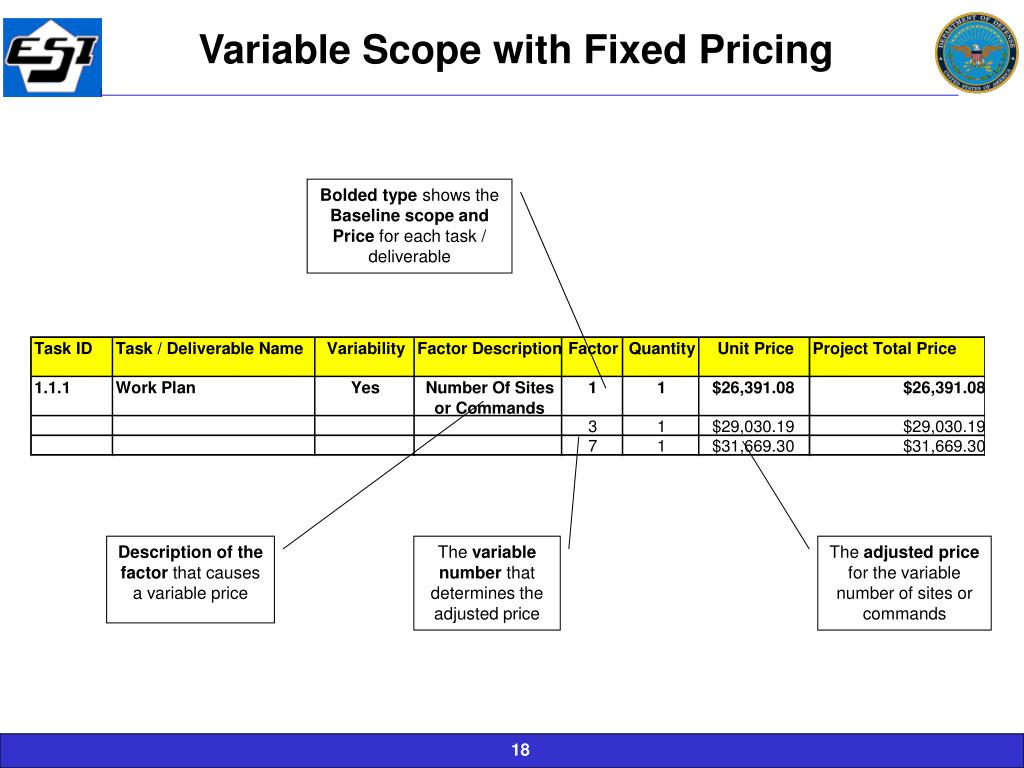 Variable Scope with Fixed Pricing Bolded type shows the Baseline scope and Price for each task / deliverable Description of the factor that causes a variable price The variable number that determines the adjusted price The adjusted price for the variable number of sites or commands