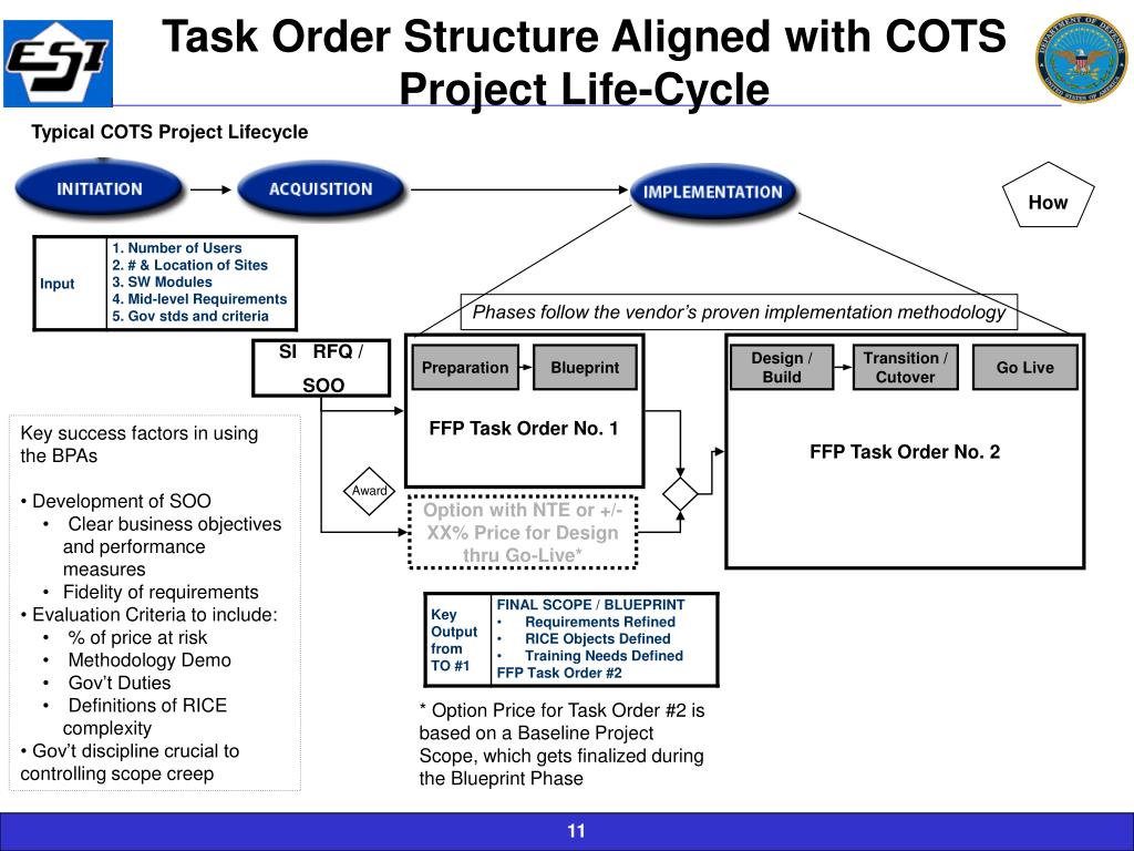 Task Order Structure Aligned with COTS Project Life-Cycle Typical COTS Project Lifecycle How Phases follow the vendor’s proven implementation methodology FFP Task Order No. 1 FFP Task Order No. 2 SI RFQ / SOO Preparation Blueprint Design / Build Transition / Cutover Go Live • Key success factors in using the BPAs • Development of SOO • Clear business objectives and performance measures • Fidelity of requirements • Evaluation Criteria to include: • % of price at risk • Methodology Demo • Gov’t Duties • Definitions of RICE complexity • Gov’t discipline crucial to controlling scope creep Award Option with NTE or +/- XX% Price for Design thru Go-Live* * Option Price for Task Order #2 is based on a Baseline Project Scope, which gets finalized during the Blueprint Phase